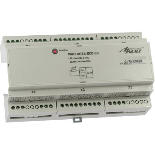 16-ти канальный модуль аналогового вывода с групповой гальванической развязкой на RS485. Выбор выходного сигнала – при заказе. Программное задание диапазона выходного сигнала и значение уровней выхода по умолчанию после подачи питания. Защита всех входов/выходов